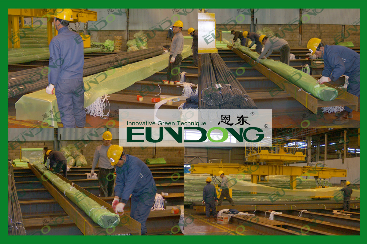图示为某钢铁厂运用恩东气化性防锈膜包装出口海运钢筋。